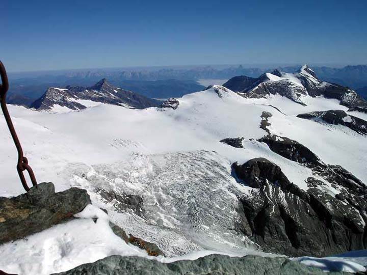 Blick nach Norden auf die Gletscher und Berge bis zum Gr. Wiesbachhorn, hinten u.a. das Kaisergebirge