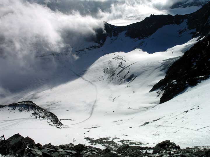Blick hinunter auf den Ködnitzkees und der Spur herauf von der Stüdlhütte