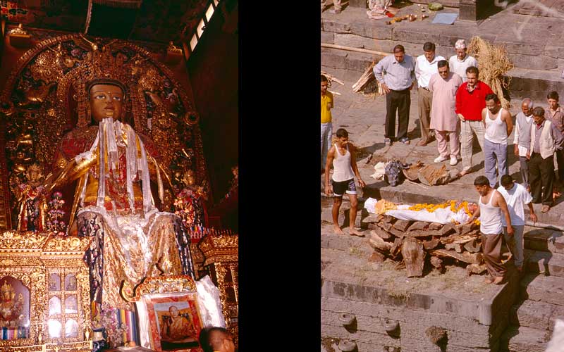 Buddha - Statue in einem Tempel - und - Leichenverbrennung am Fluss