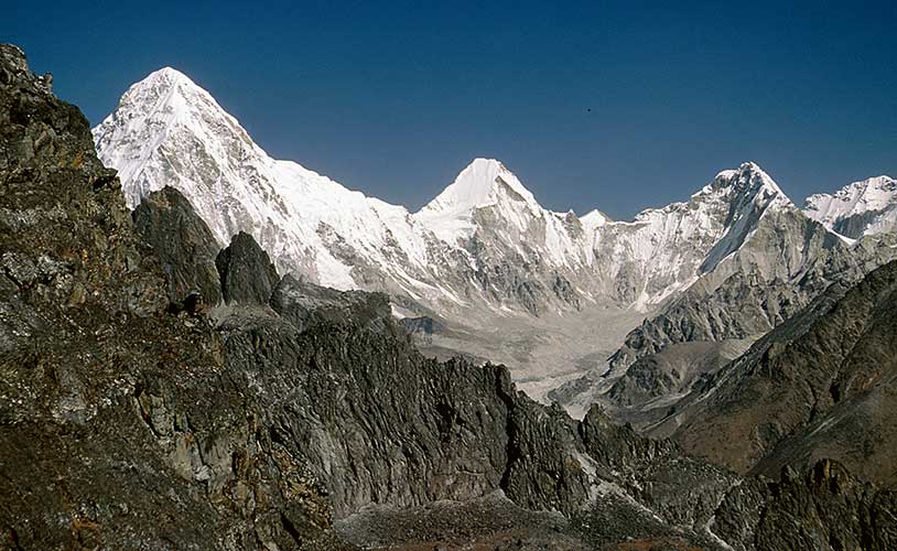 Blick nach Norden v.l.n.r. : Pumori 7138m - Lingtren 6714m - Khumbutse 6665m über dem Changri Shar Gletscher