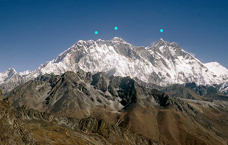 v.l.n.r. : die Wand des Nuptse 7861m (o) - der Gipfel des Everest 8848m (o) und der Lhotse 8516m (o)