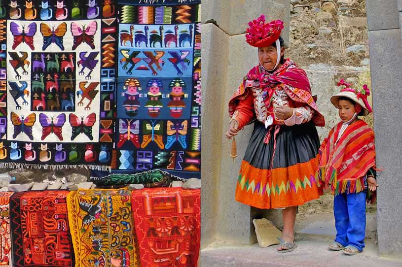 farbenfrohe Webarbeiten und Einheimische in Trachten