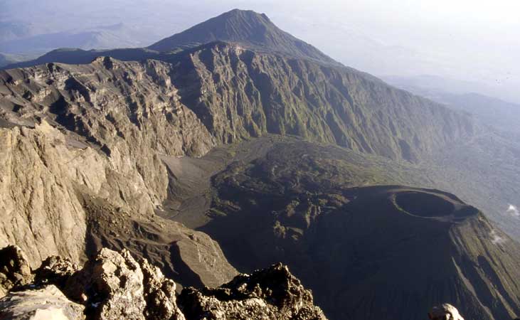 vorn der Ash Cone mit dem Rand des alten Kraters, ganz hinten der Little Meru
