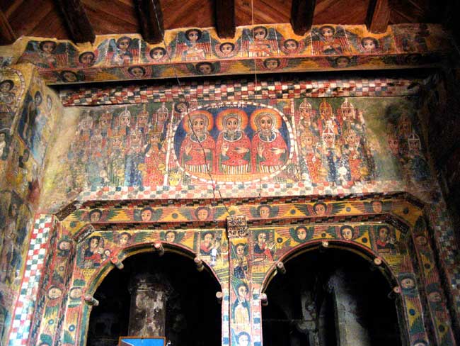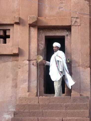 Malerei in einer Felsenkirche und ein Priester vor der Felsenkirche