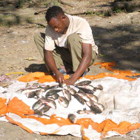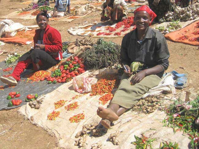 Marktstände mit Paprika und Peperoni und auch frischen Fisch gibt es auf dem Markt