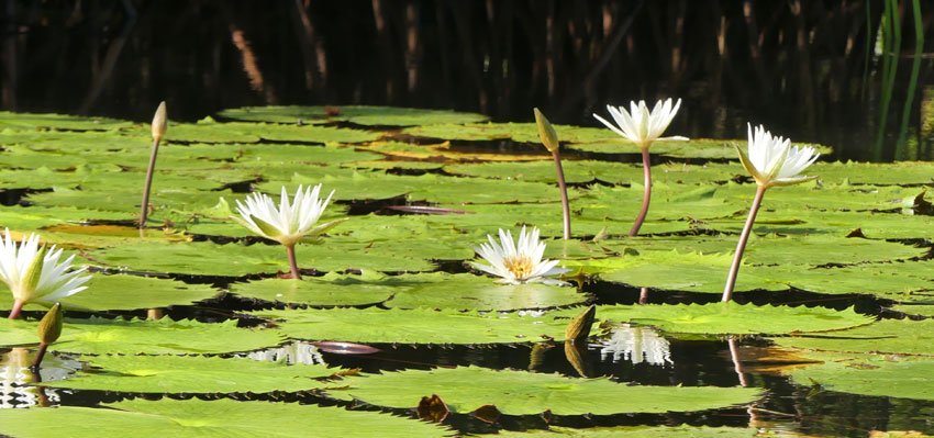 Die wunderschönen Seerosen bedecken weite Flächen des Wassers im Mangrovenwald