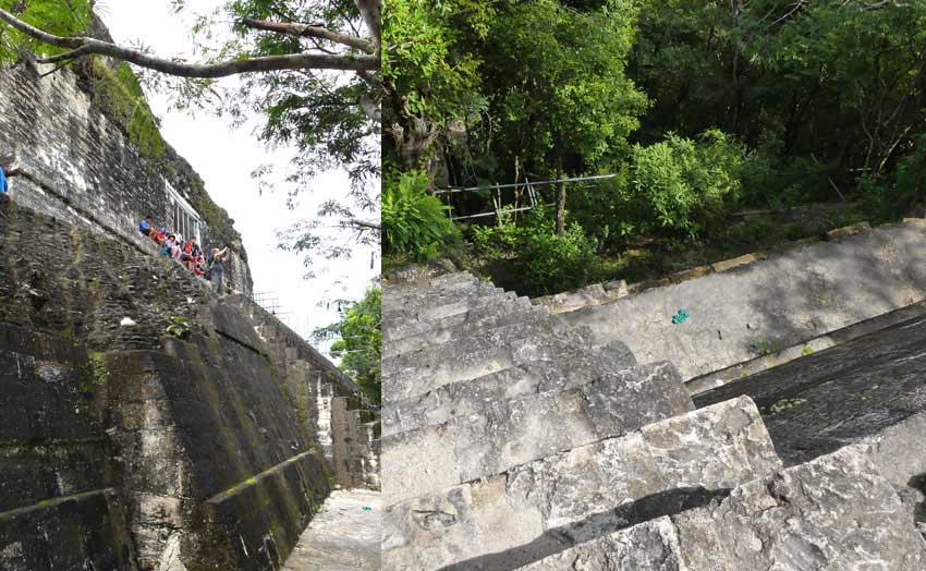 Die Treppen von Tempel IV sind wahnsinnig steil und brüchig. Nur über eine Holztreppe erreicht man die Spitze.