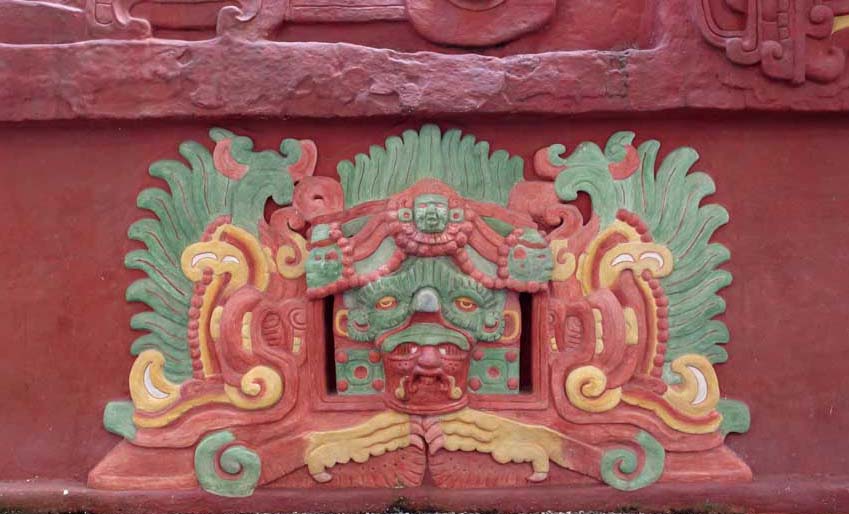 Rekonstruiertes Stuckrelief des Rosalila - Tempels. Alle Tempel waren ursprünglich farbig.