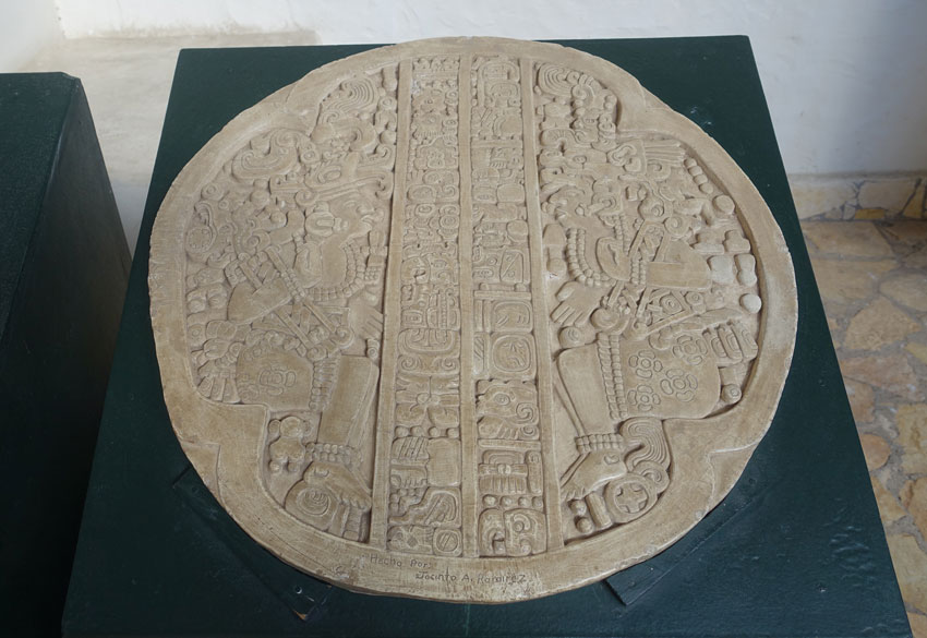 Rekonstruktion des Disco Marcador. Die Reliefs stellen K'inich Yax K'uk' Mo' und seinen Sohn K'inich Popol Hol dar.