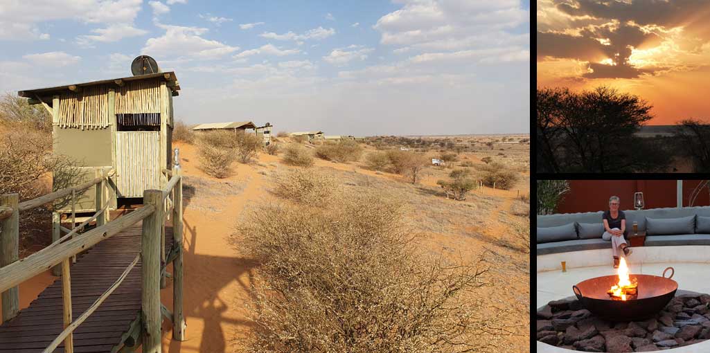 Auf der ersten und westlichsten Düne der Kalahari stehen die Zelthäuser der Teufelskrallen Lodge. Sundown und abendliches Lagerfeuer.