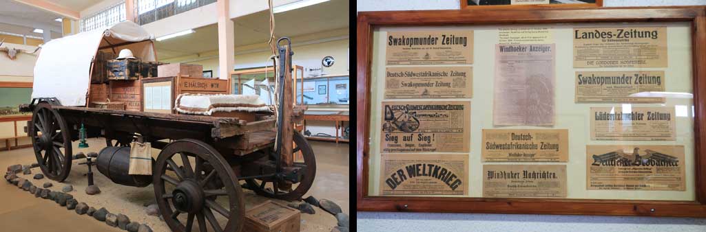 Im sehenwerten Museum findet man neben einem alten Ochsenwagen auch alte Zeitungsauschnitte der deutschsprachigen Zeitungen Namibias.