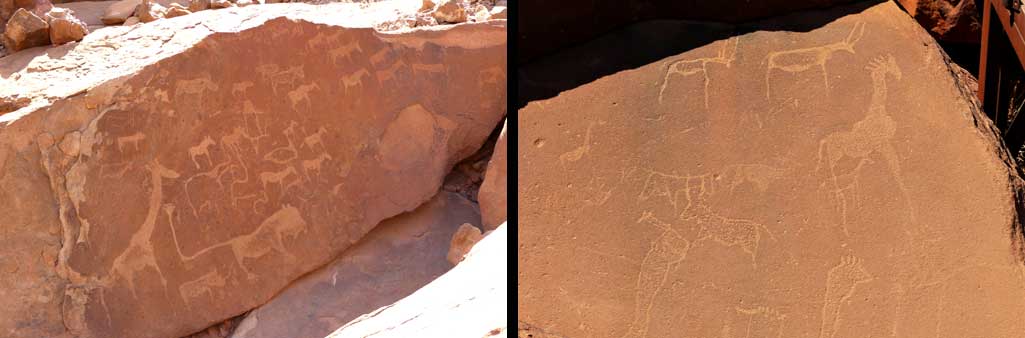 In einem Tal des Damara-Berglandes findet man ca. 2500 dieser einzigartigen Felsgravuren der San (Buschleute), ohne metallische Werkzeuge hergestellt.