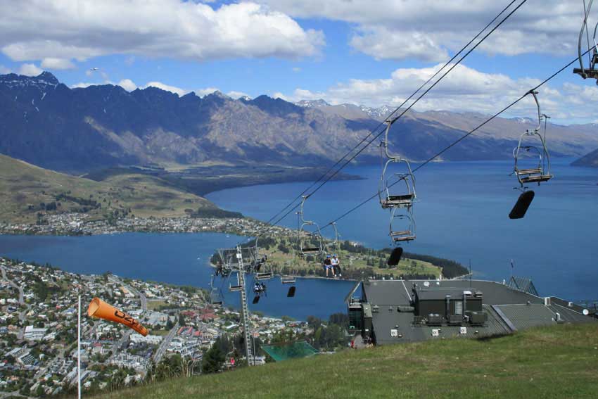 Mit der Skyline Gondola geht's hinauf zur Aussicht und zur Sommerrodelbahn Blick auf den Südteil des Lake Wakatipu