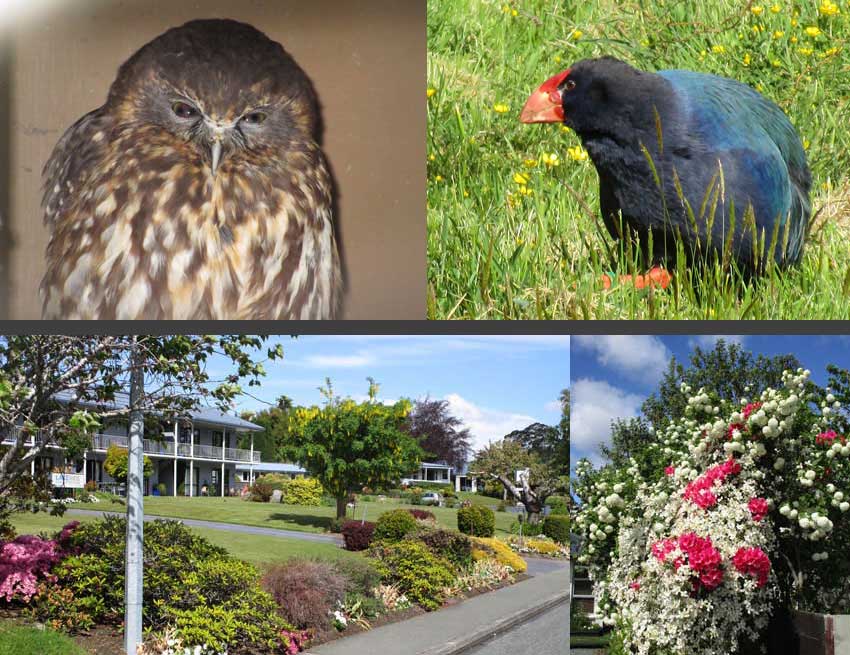 Im Tierpark: Eine Eule und der seltene, flugunfähige Südinsel-Takahe. Te Anau ist ein gepflegter Urlaubsort mit schönen Gärten