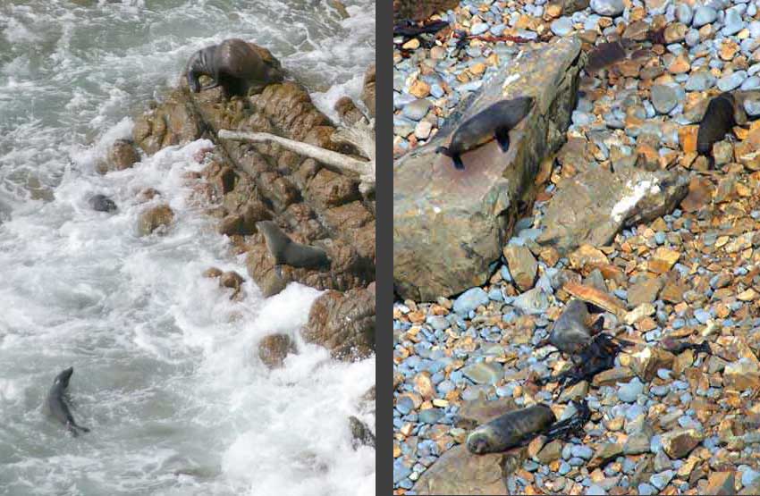 Die Seelöwen tummeln sich im Wasser und eine Gruppe Pelzrobben sonnt sich unterhalb der Felswand