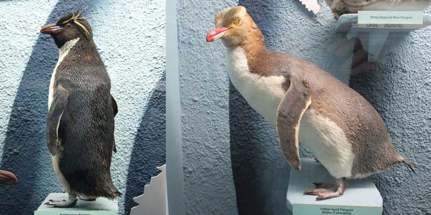 Gegen Abend kommen die Gelbaugenpinguine (rechts) an Land. Links ein Rockhopper - Pinguin