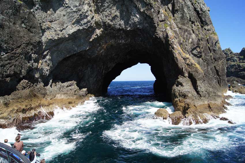 "Normalerweise" fährt das Schiff durch das Loch im Fels, aber die See ist zu unruhig