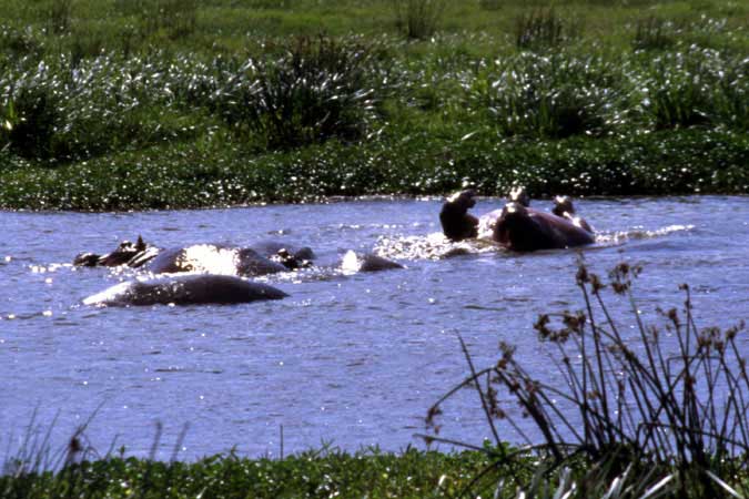 ein Flusspferd, das sich im Wasser auf den Rücken wälzt