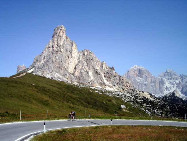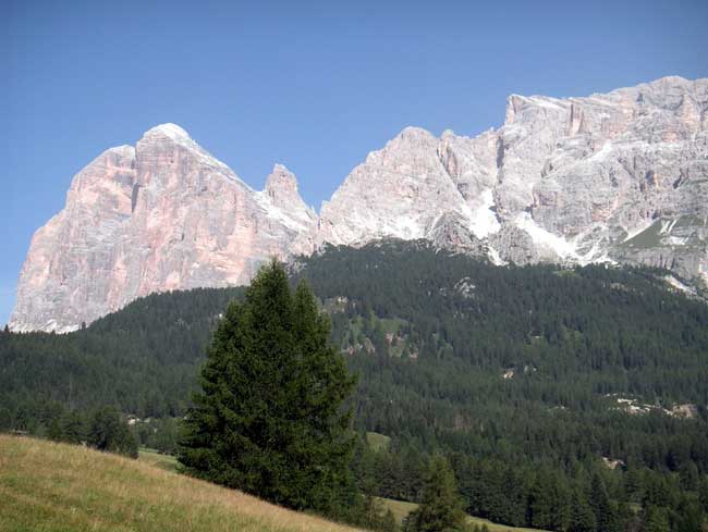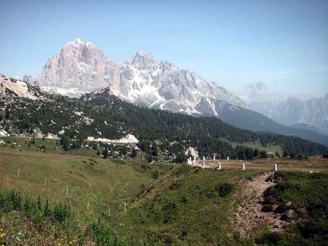 vorn die alte Paßstrasse, hinten die Tofane und die Hohe Gaisl